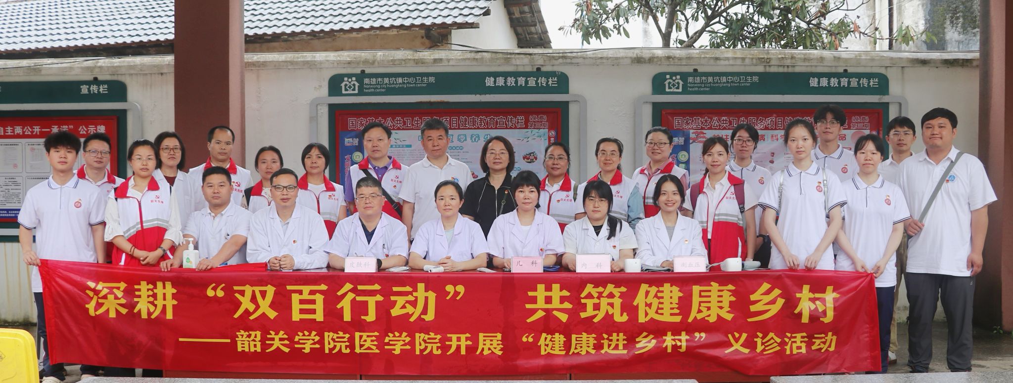 5月18日,韶关学院医学院以党建为引领,组织教师第二党支部、教师第三党支部及临床实习学生党支部 31名党员医护人员,奔赴南雄市黄坑镇卫生院开展“深耕‘双百行动’共筑健康乡村”主题义诊暨主题党日活动,将优质医疗资源送到基层群众“家门口”,以实际行动践行“百千万工程”惠民初心。
