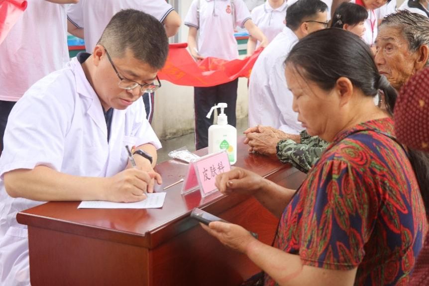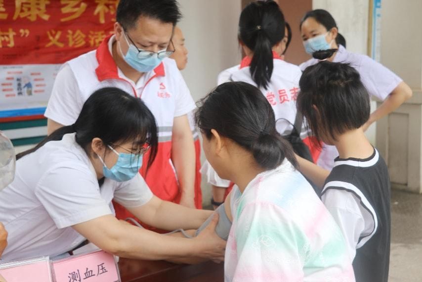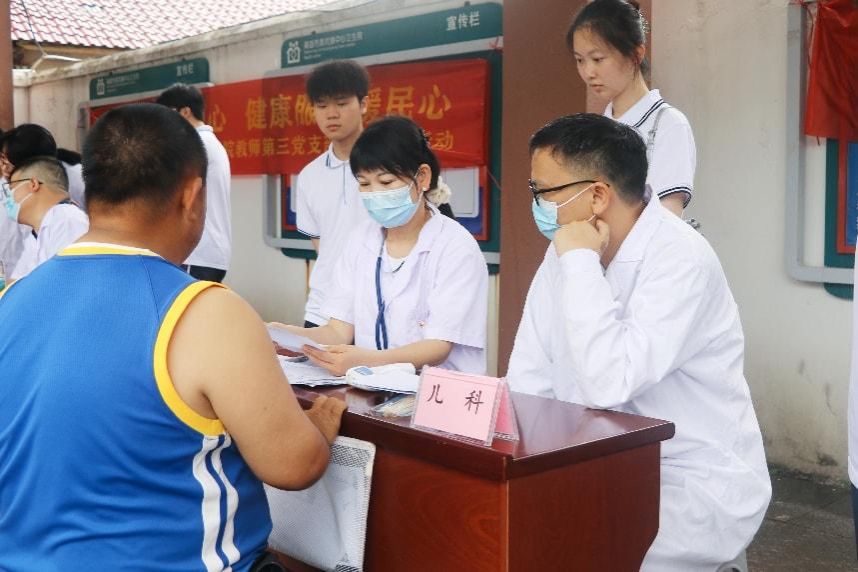 清晨7时许,由6名专科医生、20名教师及5名学生党员组成的义诊宣教团队整装出发。抵达现场后,党员们亮身份、树旗帜,在黄坑镇卫生院的帮助下迅速搭建起内科、儿科、皮肤科和公共卫生四个专科诊台,同步设置血压测量区、血糖测量区、健康宣教区和药品发放区。教师第三党支部书记张春娥表示“我们把主题党日开到义诊一线,就是要让党旗在服务群众的阵地上高高飘扬。”此次活动将党组织生活深度嵌入医疗服务一线,既是党建与业务同频共振的创新实践,也是教师党员以言传身教为学生党员打造的“沉浸式”初心课堂——从专科诊台的问诊示范到健康宣教的现场教学,教师党员以医者担当为“教材”,在服务群众的实景中生动诠释“健康所系、性命相托”的誓言,让“守初心、担使命”的精神谱系在“传帮带”中薪火相传。