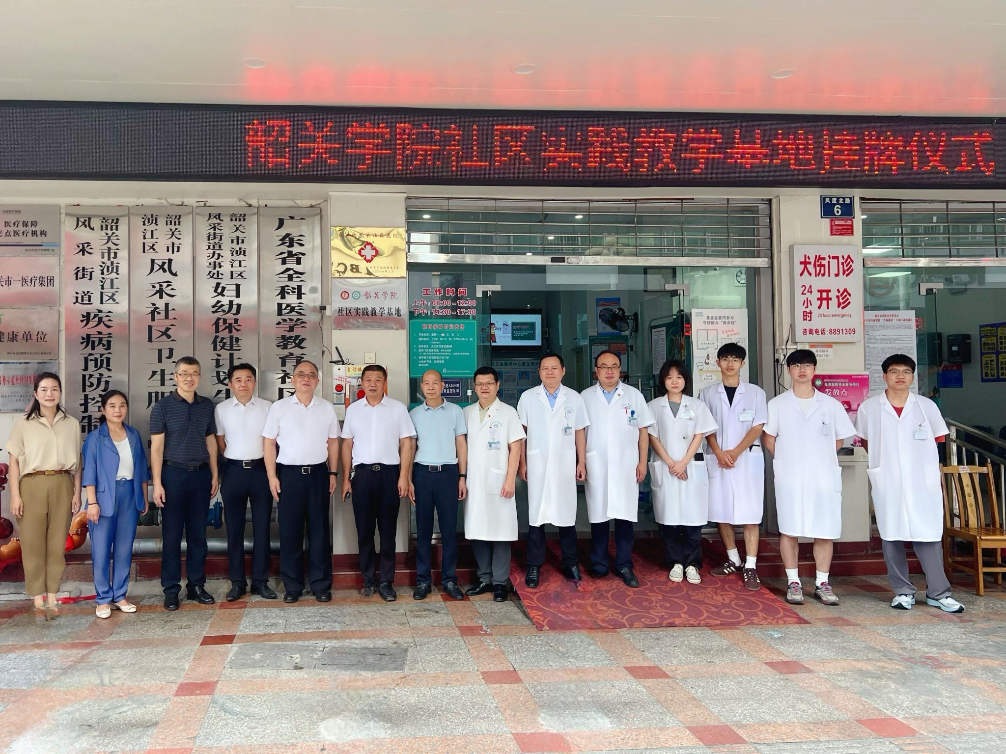 7月29日上午,韶关学院医学院领导班子、韶关学院教务部副部长朱定和一行在韶关市第二人民医院院长刘荣军,韶关市浈江区卫健局局长雷小军,新华街道五祖路居委会主任胡玲玲,以及各社区卫生服务中心主任、副主任代表等人的见证下,与韶关市浈江区东河、风采、武江区惠民街道、新华街道4间社区卫生服务中心联合举行社区实践教学基地挂牌仪式,并与各基层医疗机构领导班子和临床科室相关负责人进行了座谈。此次挂牌的顺利推进,为韶关学院医学院与地方合作按下“启动键”,也标志着校地协同推进医学人才培养步入了一个新阶段。