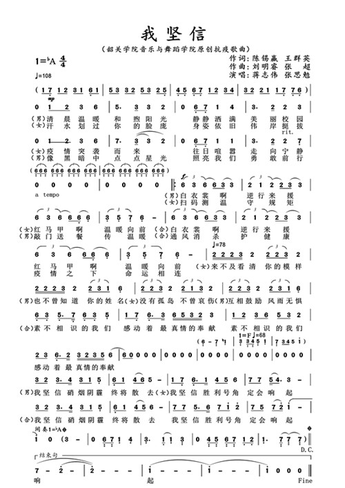 疫情防控期间,音乐与舞蹈学院党委积极响应学校的号召,发挥专业特色,群策群力,积极创作抗疫作品。声乐作品《我坚信》,由陈锡赢、王群英作词,刘明睿、张超作曲,蒋志伟、张思勉演唱,张超钢琴伴奏。作品表达了韶院师生众志成城齐抗疫、凝心聚力克时艰的抗疫精神。作品采用了器乐和声乐作曲技法相结合,构成宽广而又抒情、激昂而又温暖的旋律特征。作品的情绪由一浪高过一浪的开始部分逐渐转入轻轻诉说,象征着疫情的突袭而来与韶院人的美好及温情;尾声部分充满力量、慷慨激昂,热烈地结束全曲,象征着韶院师生战胜疫情势在必得的抗疫信心。同时,本作品既表达了对抗疫者不辞辛劳与真情奉献的歌颂,也诠释了韶院人对抗疫必胜的信心与希望,坚信胜利的号角定会吹响。让我们一同祝福韶关学院,愿疫情早日散去,校园依旧阳光!