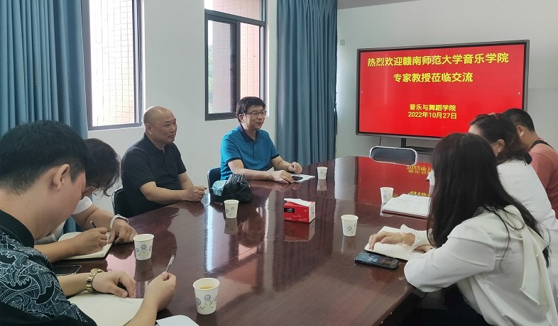 10月27日上午,赣南师范大学音乐学院谢征教授、赖剑明副教授一行前来音乐与舞蹈学院交流,我校音乐与舞蹈学院党委书记黄四明,副院长(主持工作)王群英,副院长罗涛、林嘉旋,系主任束崑、刘毅飞参加交流。