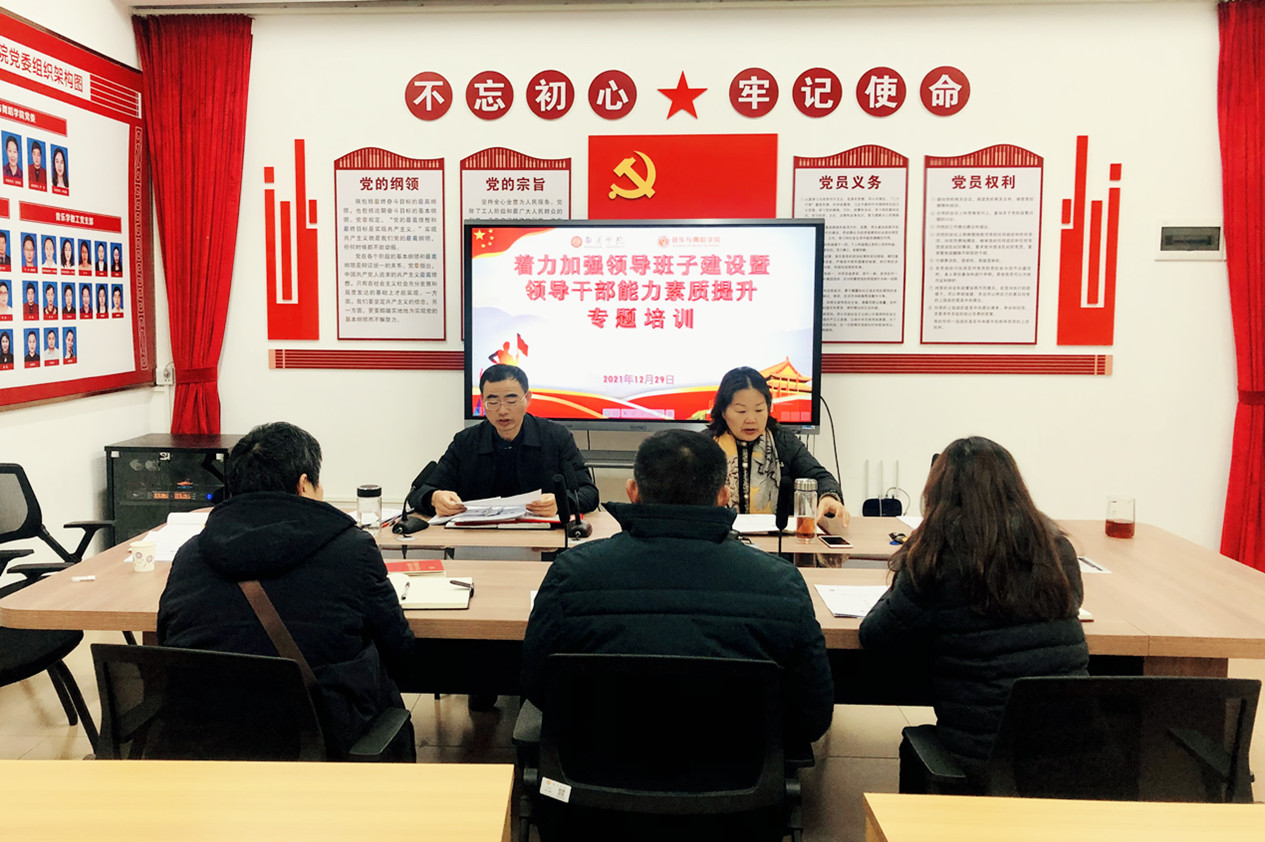 为进一步提升我院领导班子和领导干部能力素质,激发班子成员以更好的精神状态和奋斗姿态投身学院新的建设和发展的实践中,12月29日上午,我院在德馨楼会议室开展着力加强领导班子建设暨领导干部能力素质提升专题培训,全体学院领导班子成员参加了培训。学院党委书记黄四明担任本次专题培训主讲人。