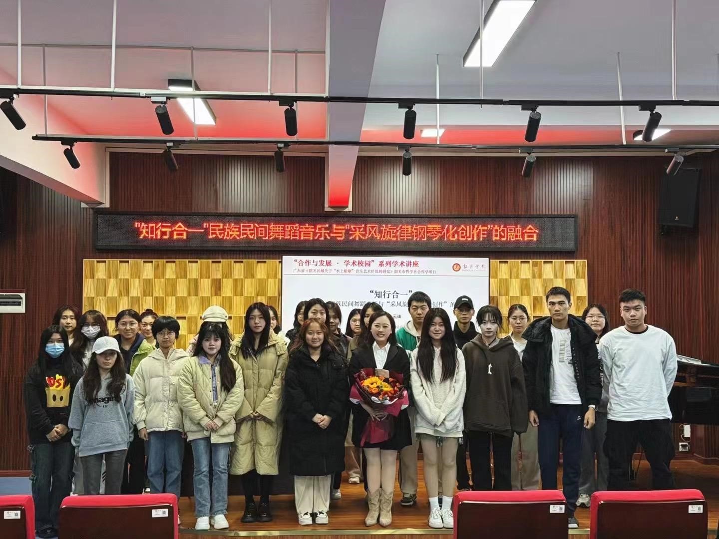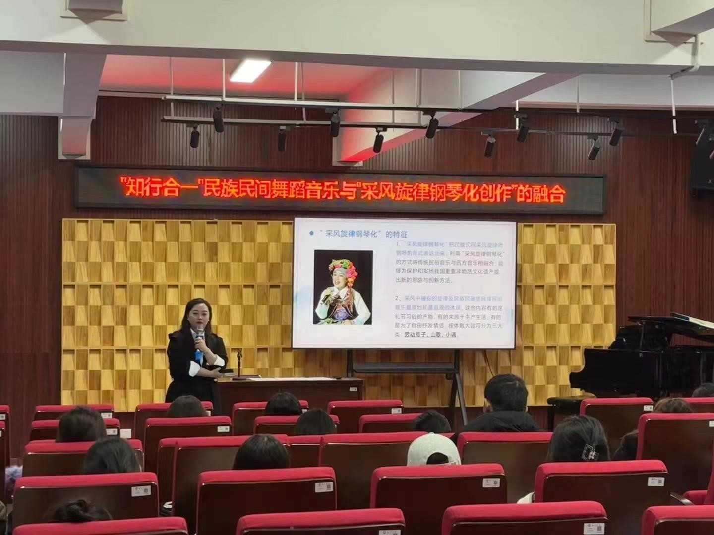 11月16日(周四)15:00,音乐与舞蹈学院在德馨楼106学术报告厅开展了“合作发展•学术校园”系列活动之“‘知行合一’——民族民间舞蹈音乐与‘采风旋律钢琴化创作’的融合”主题讲座,由音乐与舞蹈学院青年博士朱云珠主讲,100多名师生参加讲座。