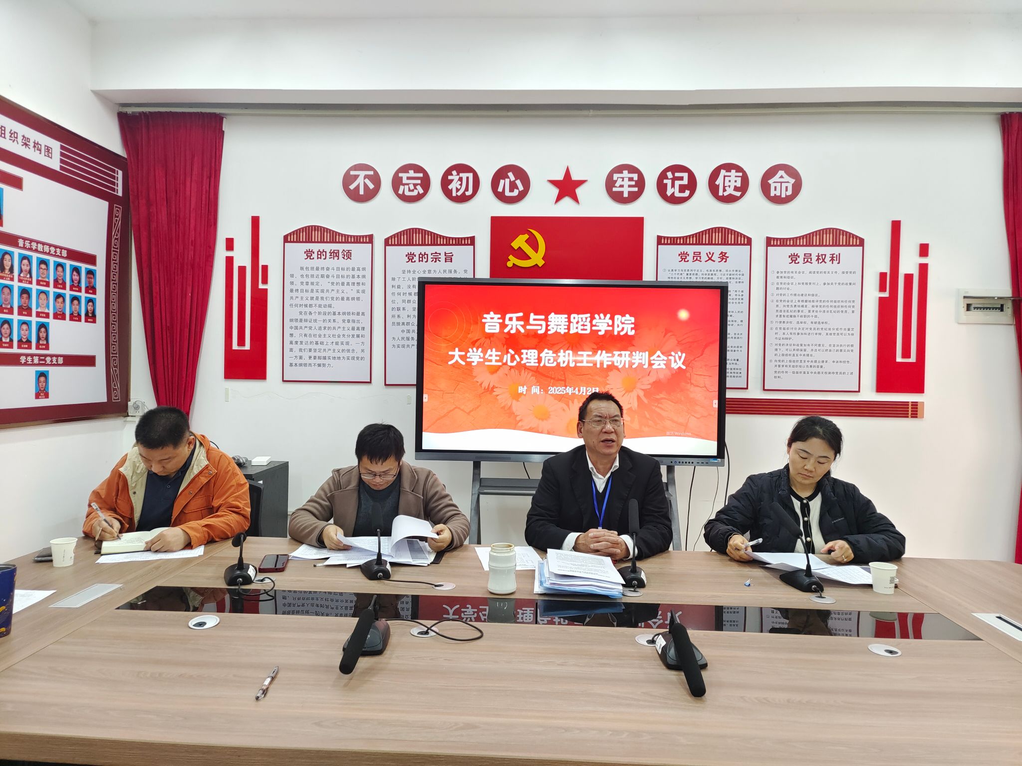 2025年4月2日下午,音乐与舞蹈学院在明德区德馨楼203会议室召开大学生心理危机干预工作研判会议。学院党委书记谷永芹、党委副书记鄢祥锋、学校心理健康教育学院院长助理武楠楠、老师蔡瑶瑶、学工办主任杨梅娟及全体辅导员、班主任参加会议。
