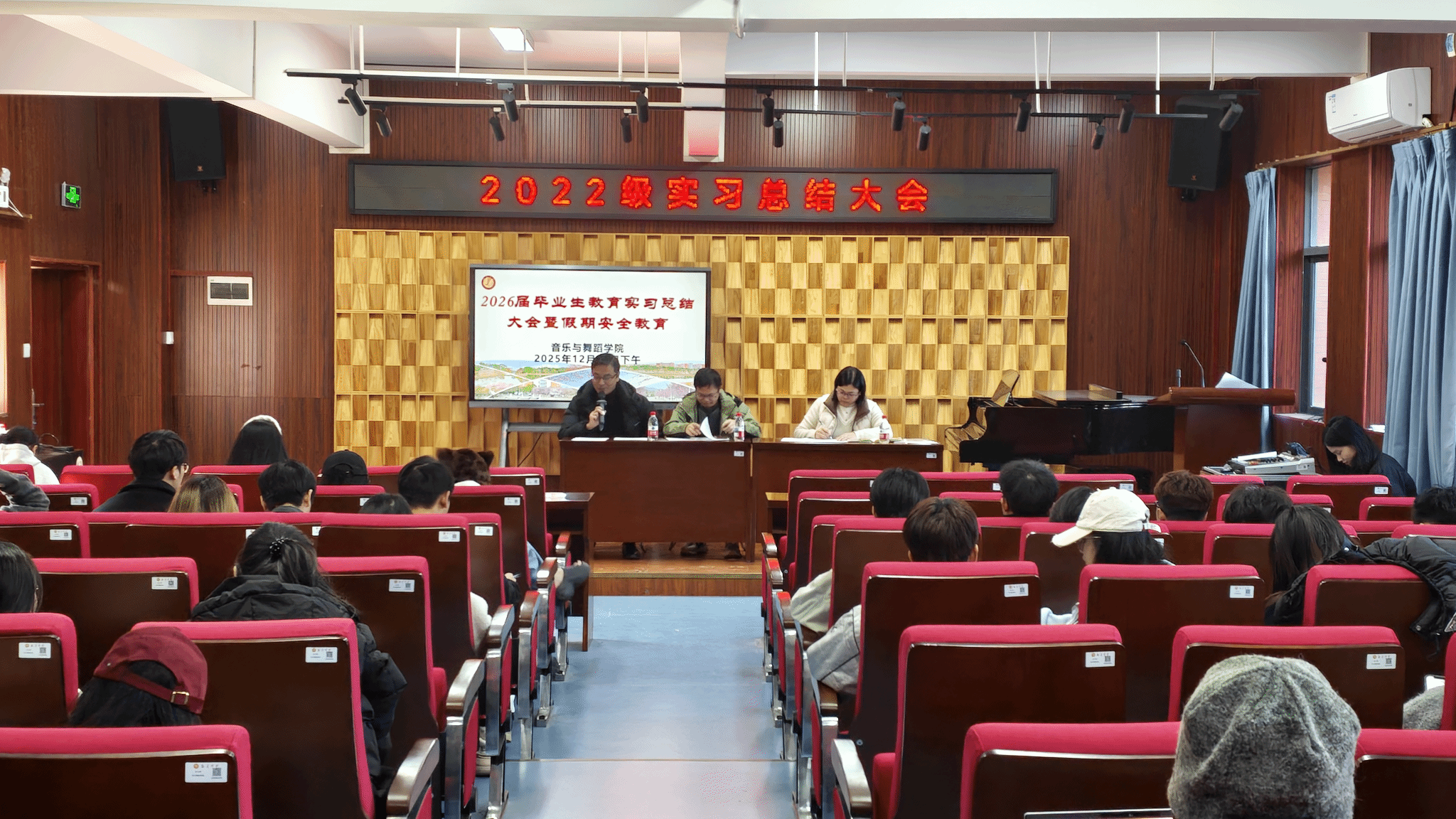 为系统总结 2026 届毕业生教育实习工作,强化学生假期安全教育,12 月 29 日,我院在德馨楼一楼 106 学术报告厅召开 2026 届毕业生教育实习总结大会暨假期安全教育会。学院党委副书记鄢祥锋、院长助理兼音乐系系主任张超、教学科研办副主任邹丽红出席会议,2022 级全体学生参会。
