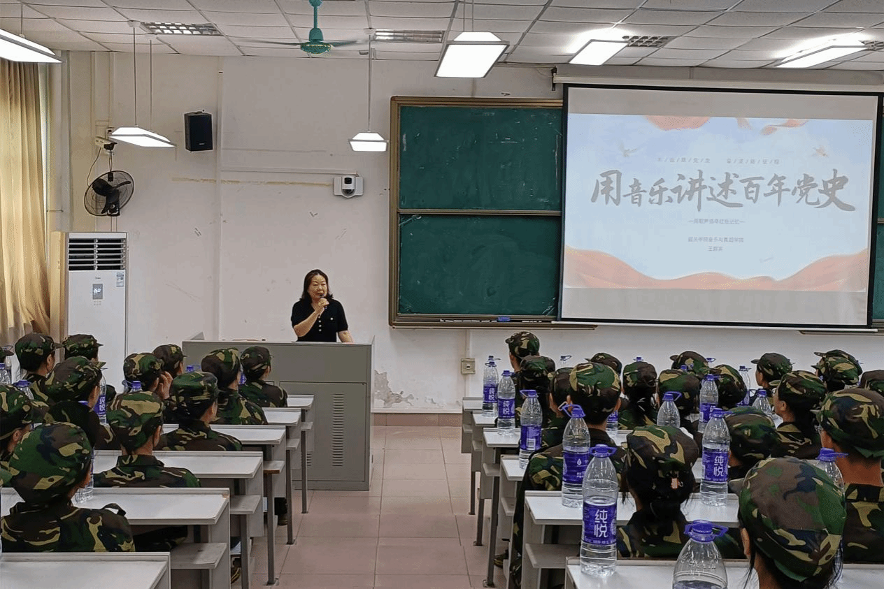 王群英以《用音乐讲述百年党史》为主题,分别从1921年至1949年、1949年至1978年、1978年至2012年、2012年至今四个时期层层递进,渐渐铺开。寄语新生继续传承历史,将热爱和忠诚代代相传,在新时代中继续前进,迎接挑战,创造更加美好的未来。
