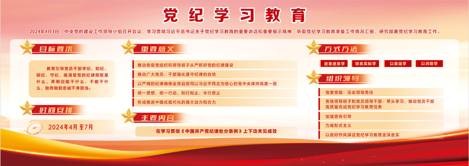 公司坚持以习近平新时代中国特色社会主义思想为指导,把贯彻落实党的二十大精神与学校中心工作结合起来,加强党纪学习教育,弄明白能干什么,不能干什么。引导公司党员、干部学纪、知纪、明纪、守纪。公司新开辟党的纪律教育宣传栏,订购党纪学习教育指导资料,增设党纪学习教育读书角,营造浓烈的党纪学习教育氛围。