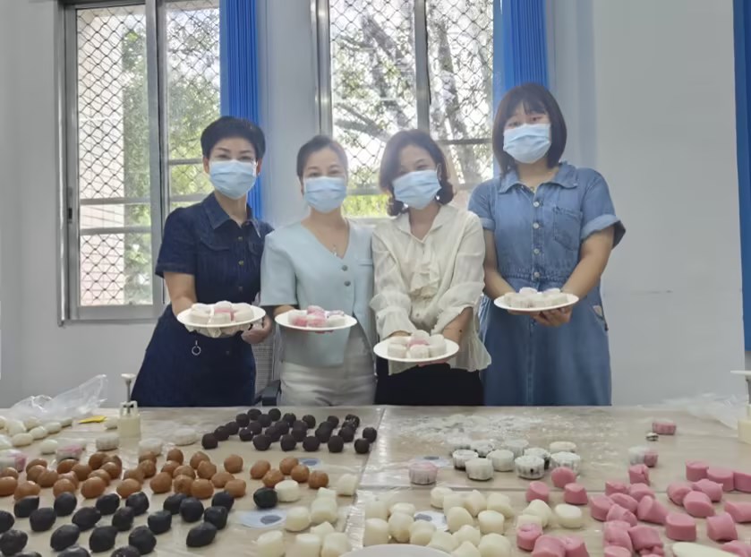 在一片欢声笑语中,一个个色彩绚丽,圆鼓鼓的冰皮月饼在手中成型,有板栗馅、紫薯馅、豆沙馅以及榴莲馅,软糯甜美,让人赞不绝口!