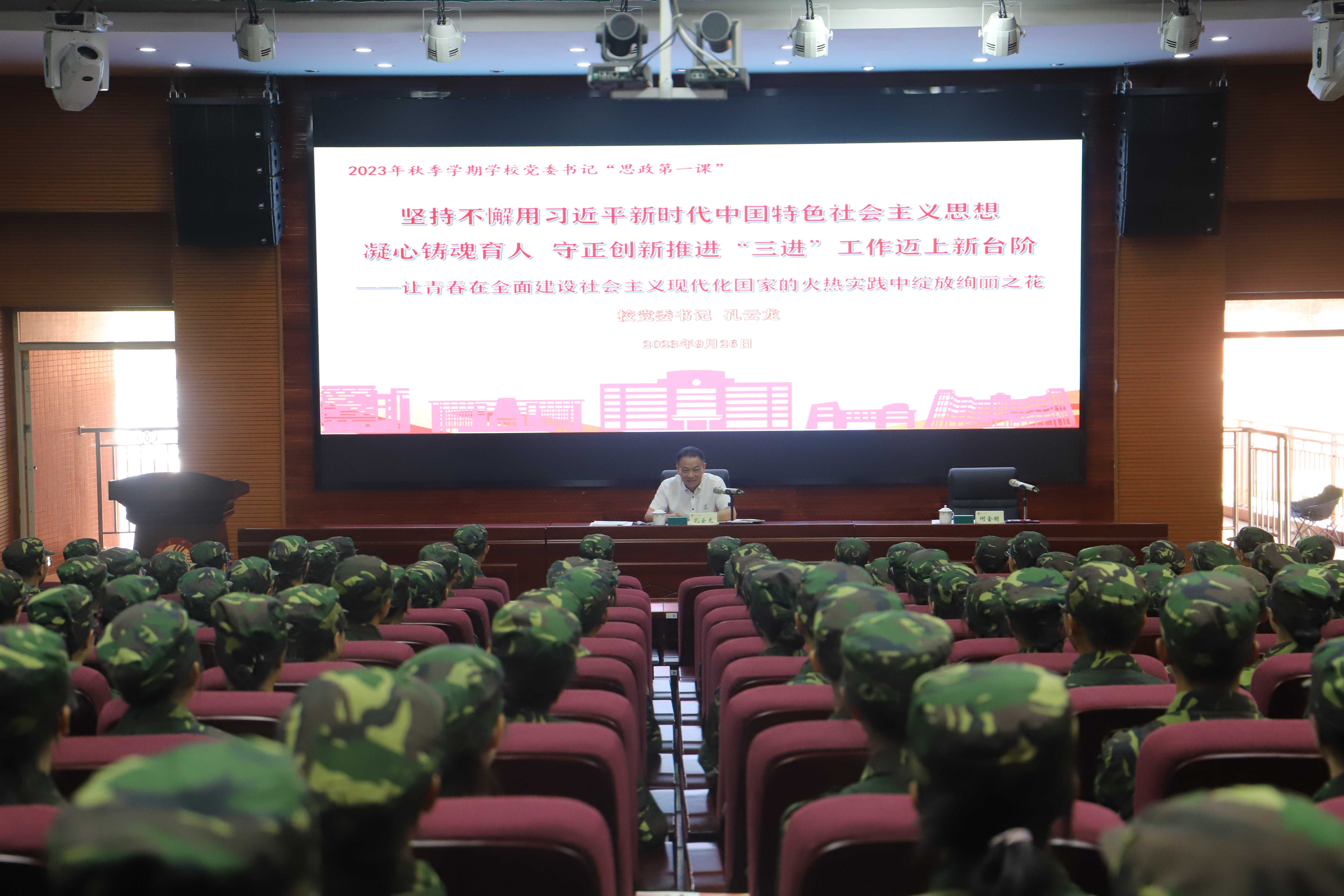 “全面系统学习领会习近平新时代中国特色社会主义思想,对于青年大学生认识我们所处的时代、认识新时代党的理论创新、认识在创新理论指导下党和国家事业发展,具有十分重要的意义。”9月26日,校党委书记孔云龙围绕习近平新时代中国特色社会主义思想进教材、进课堂、进头脑(简称“三进”),在明德区才德楼以《坚持不懈用习近平新时代中国特色社会主义思想凝心铸魂育人 守正创新推进“三进”工作迈上新台阶——让青春在全面建设社会主义现代化国家的火热实践中绽放绚丽之花》为题,给青年师生开讲“思政第一课”。此次“思政第一课”由学校副校长何金明主持。