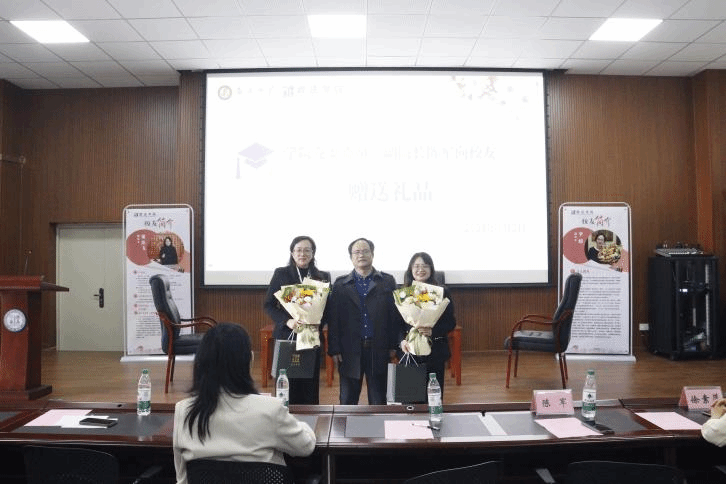在互赠礼品环节,校友、清远律师协会会长梁杰飞代表协会向学院赠送礼品。学院党委委员、副院长陈军向校友赠送礼品,感谢她们为学院发展和学生成长倾注心血。