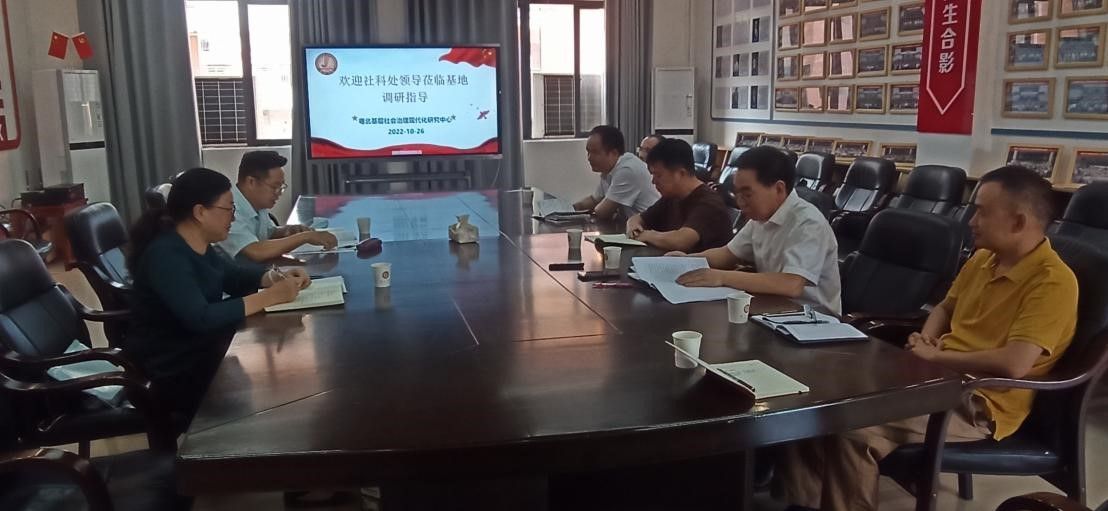 周思海处长首先说明了此次调研的目的;强调了国家、省社科联和学校对于省级社科研究基地的高度重视。接着,韩登池教授简要介绍了学院近几年科研和基地建设情况,并就社科类基地建设提出三点建议:一是关于省级社科类重点实验室建设,建议本基地团队成员前往省内已立项的社科类重点实验室进行学习交流;二是建议校内设立专门的省级社科研究基地管理机构,以便明确研究重点和方向,整合研究资源,并做好近长期规划;三是建议学校加大社科研究基地经费投入,尤其是学校自主经费的投入。然后,曾保根教授介绍了基地建设目标,承诺基地将坚持以习近平新时代中国特色社会主义思想为指导,认真贯彻落实党的二十大精神,整合校内外优质资源,围绕基层自治现代化、法治现代化、德治现代化和智治现代化四个方向开展研究,为加快粤北基层社会治理现代化提供系列政策建议,力争成为全省乃至全国欠发达地区提供社会治理新模式,为全国加快基层社会治理现代化贡献社科智慧。并且,就基地目前遇到的现实困难及下一步工作计划进行了详细汇报。