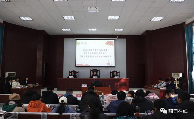韶关学院政法学院开展“法律文化周”系列品牌活动之“124宪法宣传周普法宣传之模拟审判”、“砥砺奋进普法路 青春就业焕新篇”普法宣传活动、“普法有你 宣传见报”普法手抄报设计大赛、“弘扬宪法精神 增强法治观念”法律知识竞赛、“笙歌颂法治•新光正璀璨”12•4国家宪法日暨迎新活动线上文艺作品评比、“知法懂法与法同行”政法杯辩论赛、“弘扬法治精神 培育法制观念”普法征文比赛、“如何成为一名优秀律师”校友论坛。通过丰富多彩、形式多样的活动让法律走进学生身边,极大地丰富了同学们的校园文化生活。