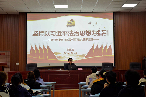 为了全面系统学习、完整准确理解习近平法治思想,始终坚持以习近平法治思想为指引,3月23日,政法学院于文德楼106举办了“坚持以习近平法治思想为指引——在新起点上奋力谱写全面依法治国新篇章”为主题的“思政第一课”。政法学院院长韩登池主讲,辅导员谢新敏及学院各年级学生干部代表参加了讲座。