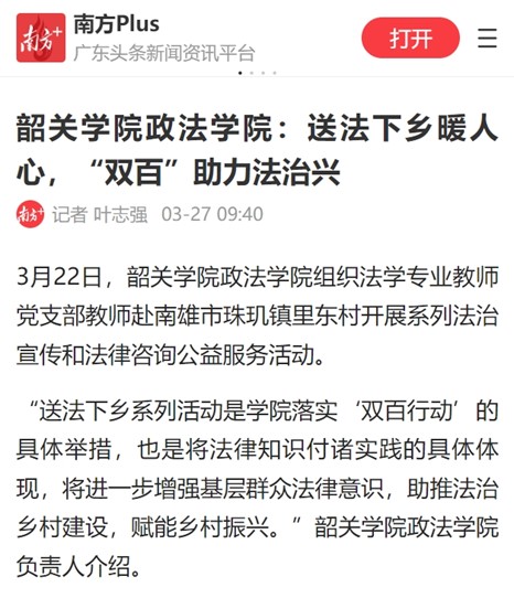 3月22日,韶关学院政法学院组织法学专业教师党支部教师赴南雄市珠玑镇里东村开展系列法治宣传和法律咨询公益服务活动。