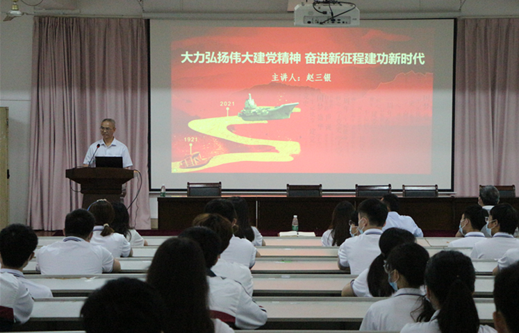 赵三银围绕“大力弘扬伟大建党精神,奋进新征程建功新时代”主题,重点从习近平总书记对伟大建党精神的阐述、伟大建党精神是中国共产党精神谱系的源头、伟大建党精神的深刻内涵和赓续传承红色血脉等四个方面详细解读了伟大建党精神。课堂上,赵三银带领师生党员重温入党誓词和“半条被子”“红军碗”等红色故事,铿锵有力的铮铮誓言,感人至深的红色故事,鲜活的人物事迹感染了现场的每一位师生。赵三银指出,新时代中国青年要在全面建设社会主义现代化国家新征程、实现第二个百年奋斗目标的伟大实践中继续弘扬光荣传统,赓续红色血脉,把伟大建党精神继承下去、发扬光大;要胸怀“国之大者”,牢记使命担当,坚定理想信念,勇于攻坚克难,争做堪当民族复兴重任的时代新人。