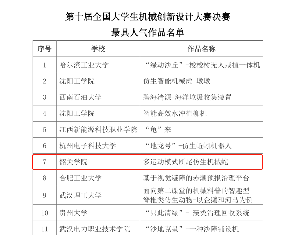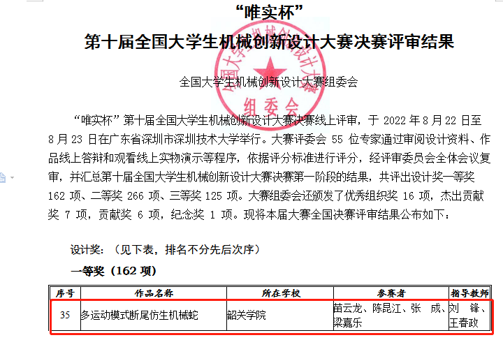 近日,2022年“唯实杯”第十届全国大学生机械创新设计大赛决赛线上评审在深圳技术大学举行,来自全国各省区市的533支队伍进入全国总决赛。我校智能工程学院“多运动模式断尾仿生机械蛇”代表队在总决赛中发挥稳定,从决赛的533支队伍中脱颖而出,荣获全国总决赛一等奖。并同时荣获经大赛组委会评选的最具人气作品奖(全国共评出15名人气奖,我校位列第7名)。