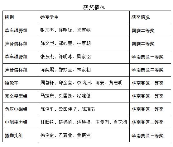 2023年8月,由中国自动化学会主办,天津工业大学承办的第十八届全国大学生智能汽车竞赛全国总决赛圆满落下帷幕,来自清华大学、哈尔滨工业大学、东南大学等全国538所高校的3138支队伍参加了分赛区的竞速类十个项目的比赛。最终504支队伍脱颖而出,进入全国总决赛。我校选拔了8支队伍参加了华南区选拔赛,其中智能工程学院的声音信标组和越野单车组经过层层选拔晋级全国总决赛,均获全国二等奖。同时,我校学子在7月份华南区选拔赛获得华南区一等奖1项、华南区二等奖5项、华南区三等奖1项、华南区优胜奖1项。充分彰显了我校学子扎实的专业知识和较强的操作实践能力,通过以赛促教、以赛促学、以赛促创,体现了我校在一流专业人才培养、学生实践创新能力训练等方面取得的优异成果。
