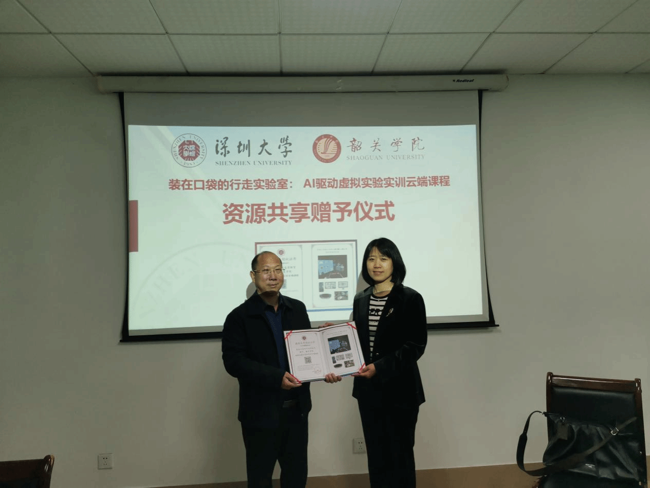 会上举行了深圳大学赠与我院“装在口袋行走实验室:AI驱动虚拟实验实训云端课程”资源课程。该课程打破了地域、经济条件对实验教学的限制,丰富了学院的教学资源。