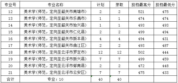 截止7月8日,依据《关于做好广东省2018年普通高校招生录取工作的通知》(粤招[2018]11号)投档原则,经广东省考试院审核,我校已完成广东省公费定向师范生(艺术类)录取工作。其中美术学(公费定向)计划招40人,实际录取40人,录取投档总分最高521分,最低431分,具体录取情况见附表。