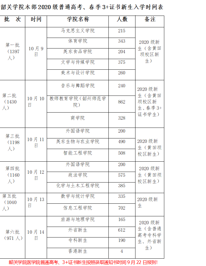 韶关学院本部2020级普通高考、春季3+证书新生入学时间安排