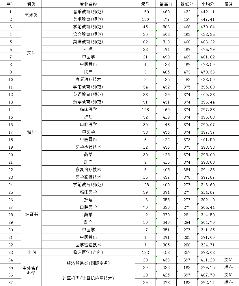 韶关学院2020年广东省各专业录取情况统计表(专科)