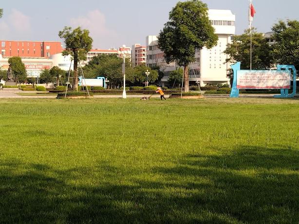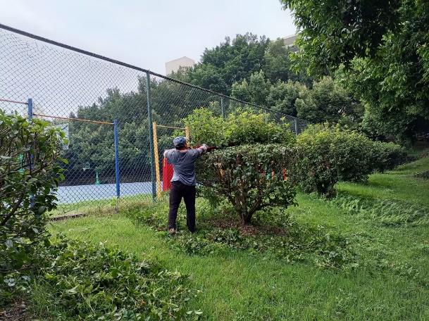 绿化人员在国庆中秋假期进行修剪枯枝杂叶、土壤浇灌等绿化工作,对学校周围的绿化带及草坪进行修整,清理危树、枯枝,消除安全隐患,深度打造文明、绿色校园。
