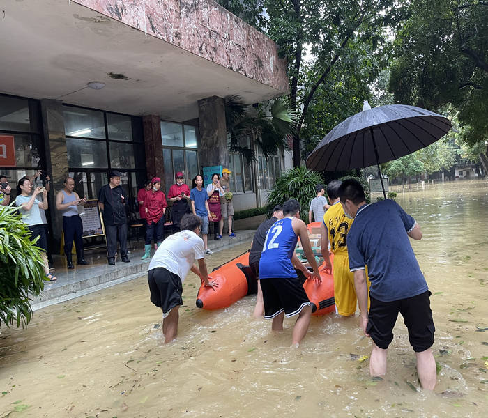 担当作为、攻坚克难,合力保障食堂供餐不掉链、人员转移不掉队。后勤处工作人员不喊累、不喊苦,在自己的岗位上默默值守,备齐备足大米、鲜肉、蔬菜、瓜果等物资,全面保障热盒饭、点心面包、方便面、矿泉水等物品,供应师生用餐需求;受暴雨影响,部分师生无法正常到食堂用餐,后勤处迅速启动“智慧送餐服务”,并与惠民北路社区通力合作,调拨应急皮艇,冒雨为黄田坝校区被困学生送去早午晚餐,合计送餐近3000份,并与学生处和安全保卫处协同作战安全转移师生近200人,用最短的时间和最高的效率保障师生用餐需求和人员转移。