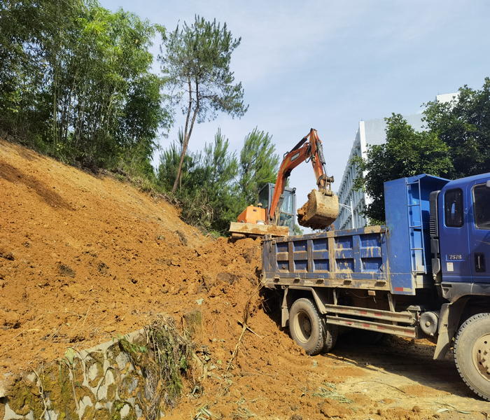 凝心聚力、共克时艰,倾力助推灾后抢修不停歇、重建不停摆。后勤处对灾后山体滑坡进行现场勘察,加强校内道路巡逻,对校内重要路段进行逐一排查,对可能存在安全隐患的重点路段隐患点进行专项摸排,通过设置警戒线、设立警示牌等方式进行围蔽,及时向校内师生发布预警信息,组织大型挖掘机等设备迅速清理疏通山体塌方,全力进行清理和维护,有力保障了校内道路通畅和校内师生的生命财产安全。