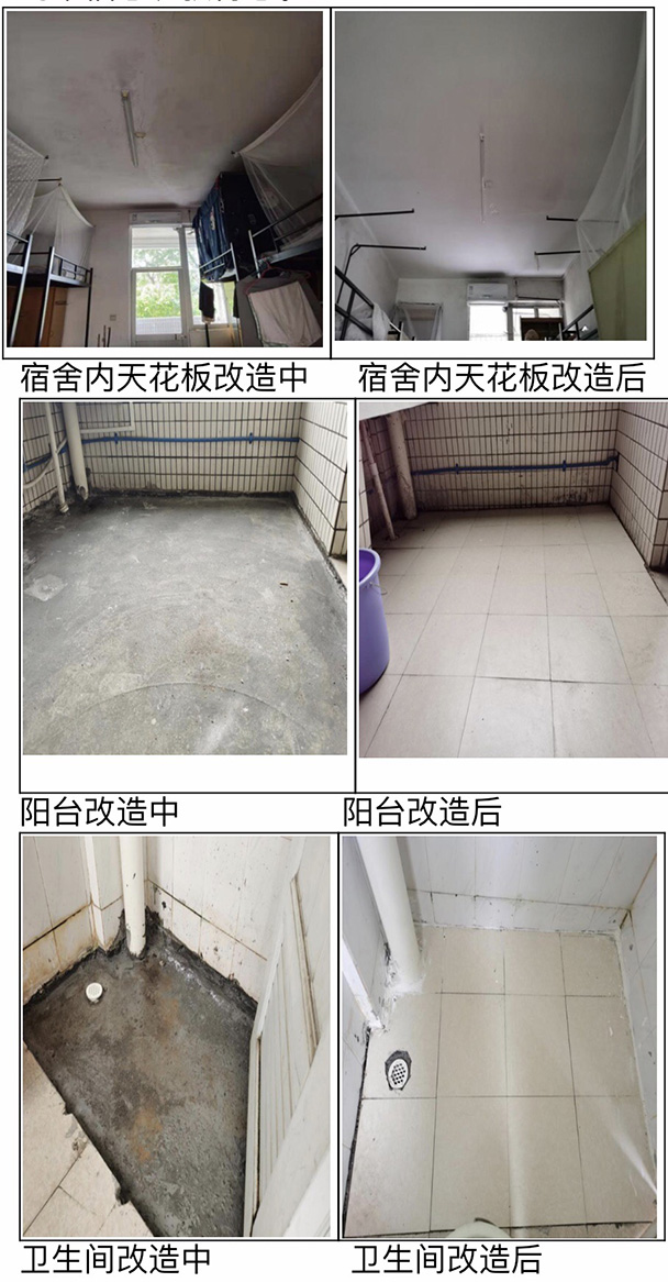 丁香苑学生宿舍漏水问题是近年来学生反映较多较强烈的热点问题。为彻底解决困扰学生学习和生活的宿舍漏水问题,后勤处、学生处等部门多次到学生宿舍察看,与补漏施工单位反复商讨补漏工艺和补漏方法,并在总结以往补漏的基础上,通过试验,优化了补漏方案,采取整层补漏方法,努力从源头上解决学生宿舍漏水事宜。2021年五一假期期间,后勤处、学生处等部门相互协助配合,完成了丁香苑G座1-3层48间学生宿舍的漏水工作,并计划于8月31日前完成丁香苑学生社区宿舍全部防水补漏工作。不断为广大学生提供良好的学习和居住环境,不断提高学生的幸福感和获得感。