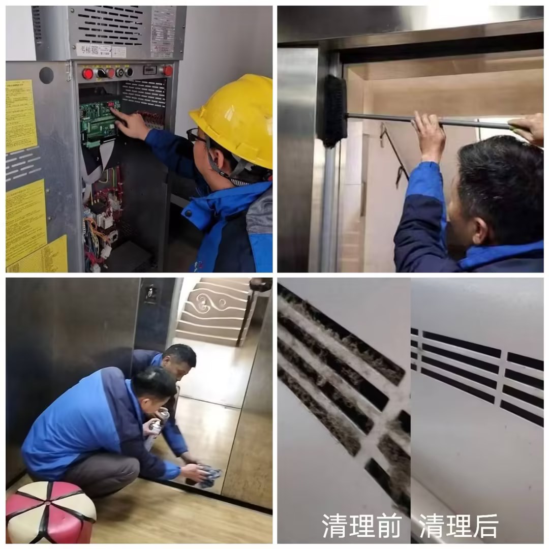 本次检查维护工作主要有三大块内容,一是对电梯紧急报警系统、限速器、安全钳、限速开关、控制柜电子版等涉及安全的部件进行全面检查,对生锈部件及时更换,上油除锈;二是对轿厢内破损的禁止标志、宣传牌、小广告清理更换,对风扇出风口、层门防夹装置内的灰尘彻底清理;三是对轿厢照明损坏、亮度不足的补充更换,并对灭火器材进行检查。