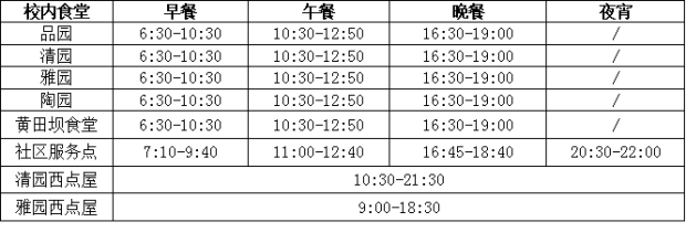 2024年5月1日-5日,各食堂教工自助餐暂停供餐,2024年5月6日起恢复正常供餐。韶乐园校区各食堂、西点屋和黄田坝校区食堂均正常营业,丹桂苑、紫荆苑、丁香苑、梧桐苑社区服务点均正常营业,其余暂停服务;校内各食堂、其他餐饮服务场所服务时间及就餐卡充值时间如下: