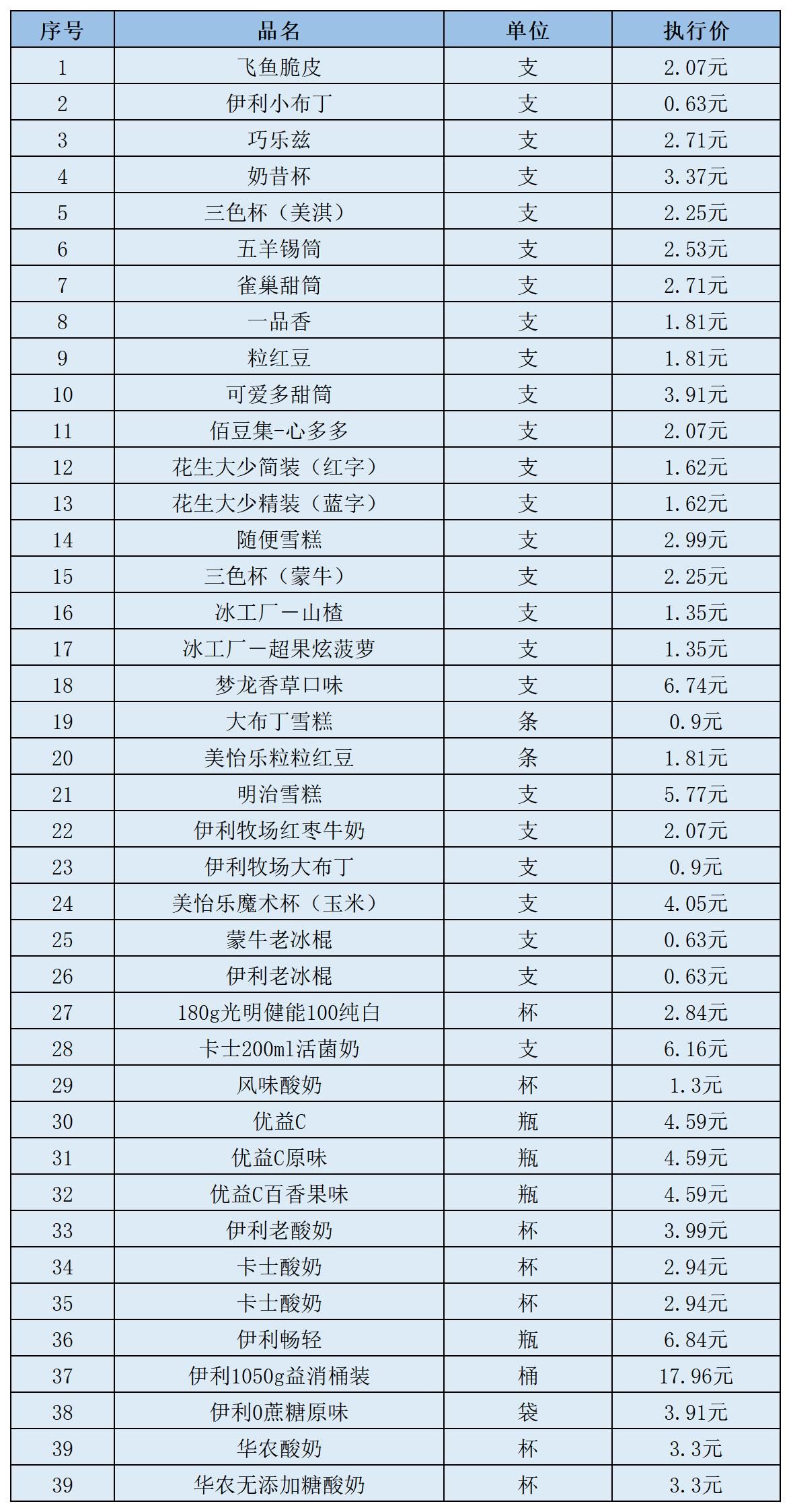 (八)雪糕及低温奶类12月11日-12月20日定价