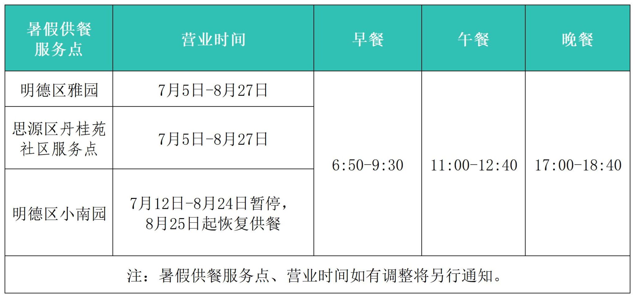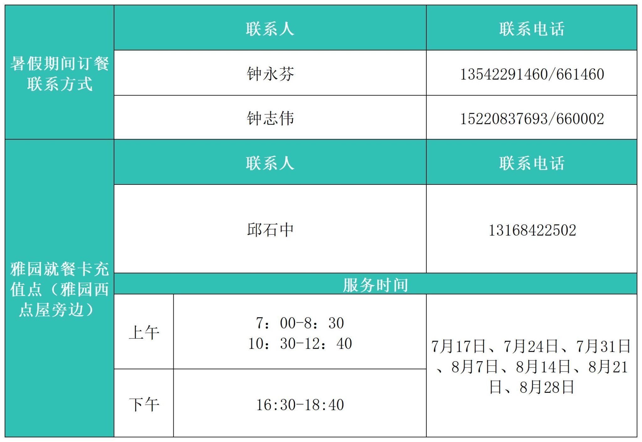 (二)7月5日—8月27日,韶乐园校区各食堂(雅园值班食堂除外)暂停,8月28日起恢复供餐。