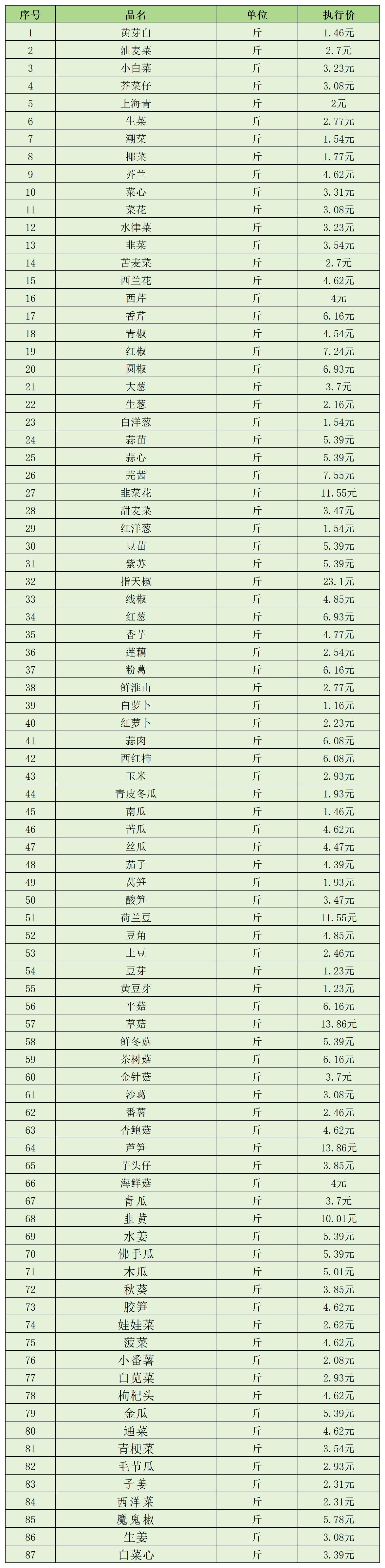 (一)蔬菜类1月11日-1月20日定价